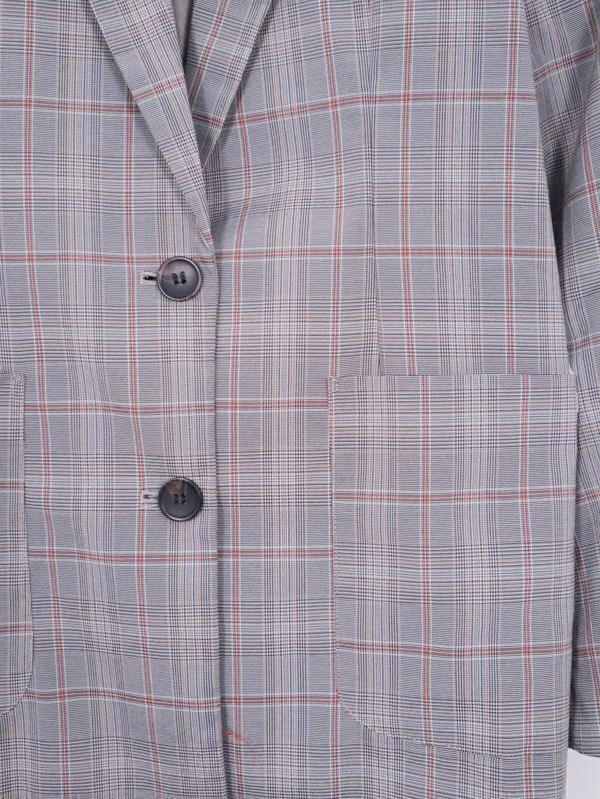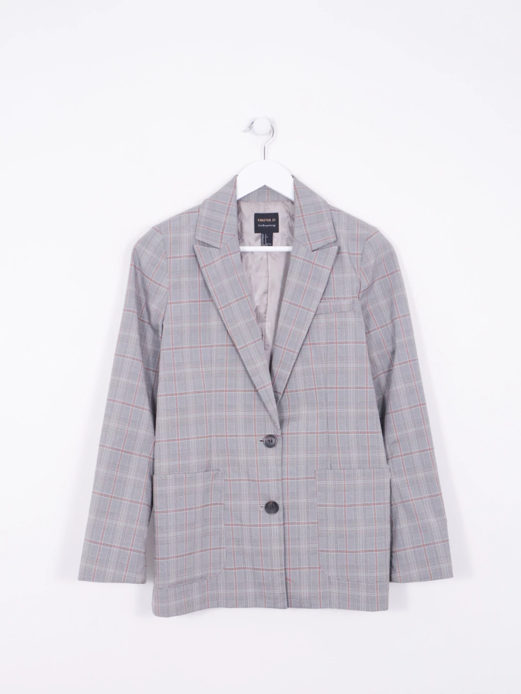 Blazer adherente de vestir. Tono gris. Motivo principe de gales en rojo, mostaza y beige. Cuello con solapa. Mangas largas. Con hombreras. Forreria en beige. Botones carey en marrón. Costuras a tono. Medidas - Ancho de hombros: 37 cm. Contorno de pecho: 90 cm. Largo total: 69 cm.