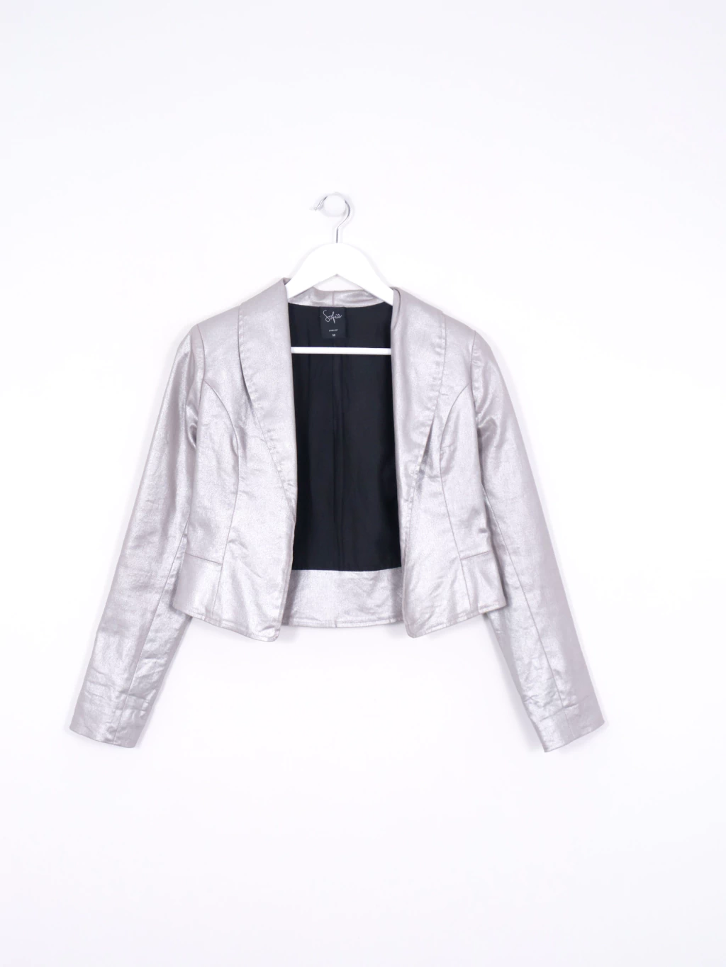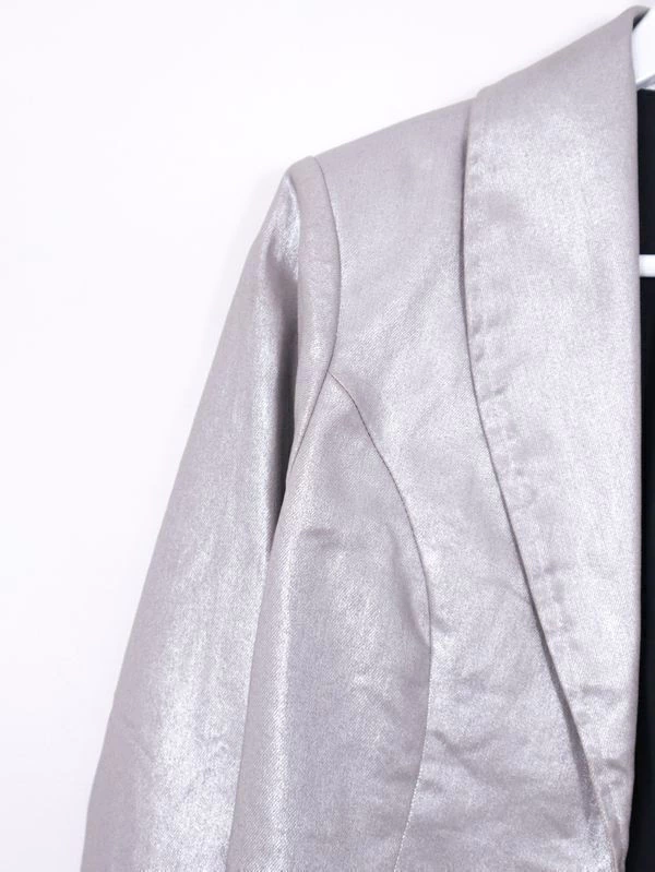 Blazer adherente de satinado. Tono plateado. Cuelllo con solapa. Recorte en espalda negro. Mangas largas. Con hombreras. Forrería en negro. Costuras a tono. Medidas - Ancho de hombros: 38 cm. Contorno de pecho: 86 cm. Largo total: 46 cm.