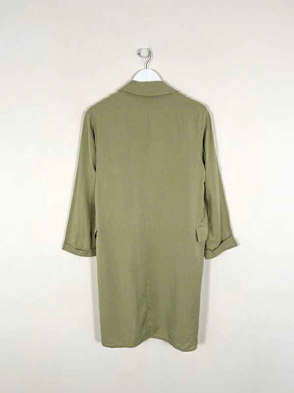 Blazer holgado liviano. Tono verde pálido. Cuello con solapa abierto. Mangas largas. Dos bolsillos. Costuras a tono. Medidas - Ancho de hombros: 43 cm. Contorno de pecho: 100 cm. Largo total: 93 cm.