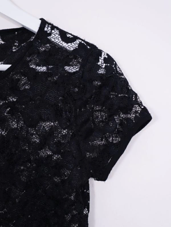 Blusa adherente de encaje translúcido. Cuello redondo. Mangas cortas. Costuras a tono. Medidas - Ancho de hombros: 38 cm. Contorno de pecho: 86 cm. Largo total: 45 cm.