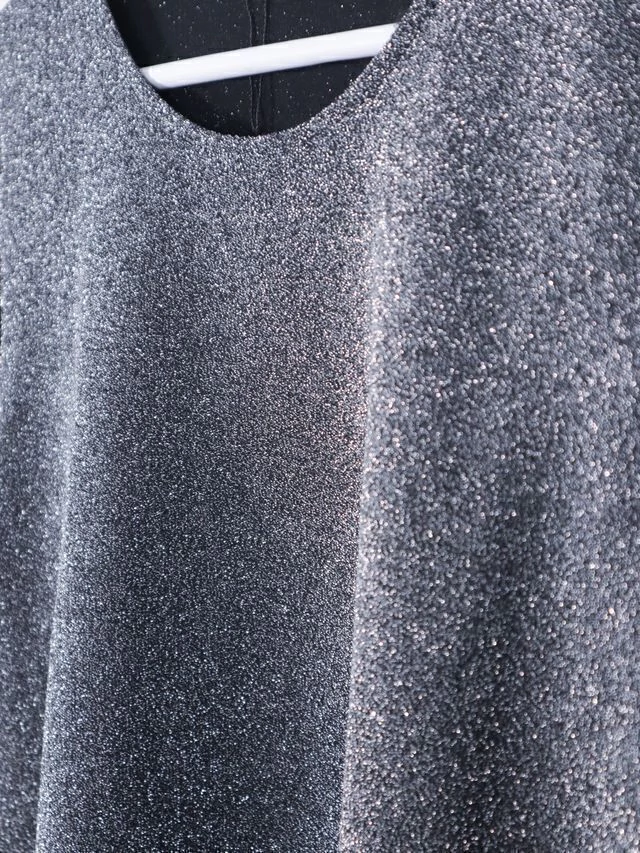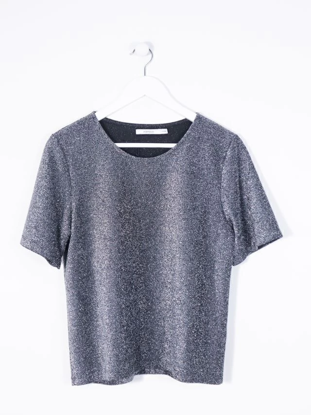 Blusa holgada de lurex. Mangas cortas. Medidas - Ancho de hombros: 38 cm. Contorno de pecho: 94 cm. Largo total: 57 cm.