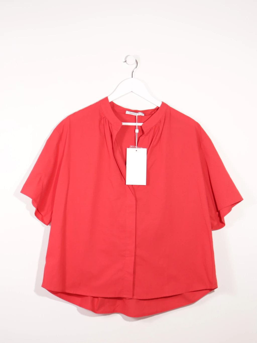 Blusa calce holgado de batista. Escote en V. Cartera con botones perlados. Mangas cortas. Medidas - Ancho de hombros: 50 cm. Contorno de pecho: 124 cm. Largo total: 62 cm.