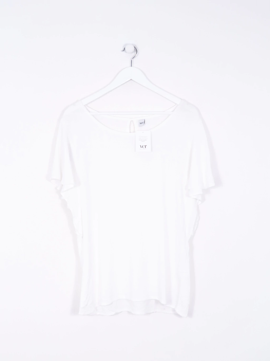 Blusa holgada liviana. Tono beige claro. Cuello redondo. Mangas cortas con recortes. Apertura en espalda. Costuras a tono. Medidas - Ancho de hombros: 41 cm. Contorno de pecho: 94 cm. Largo total: 67 cm.