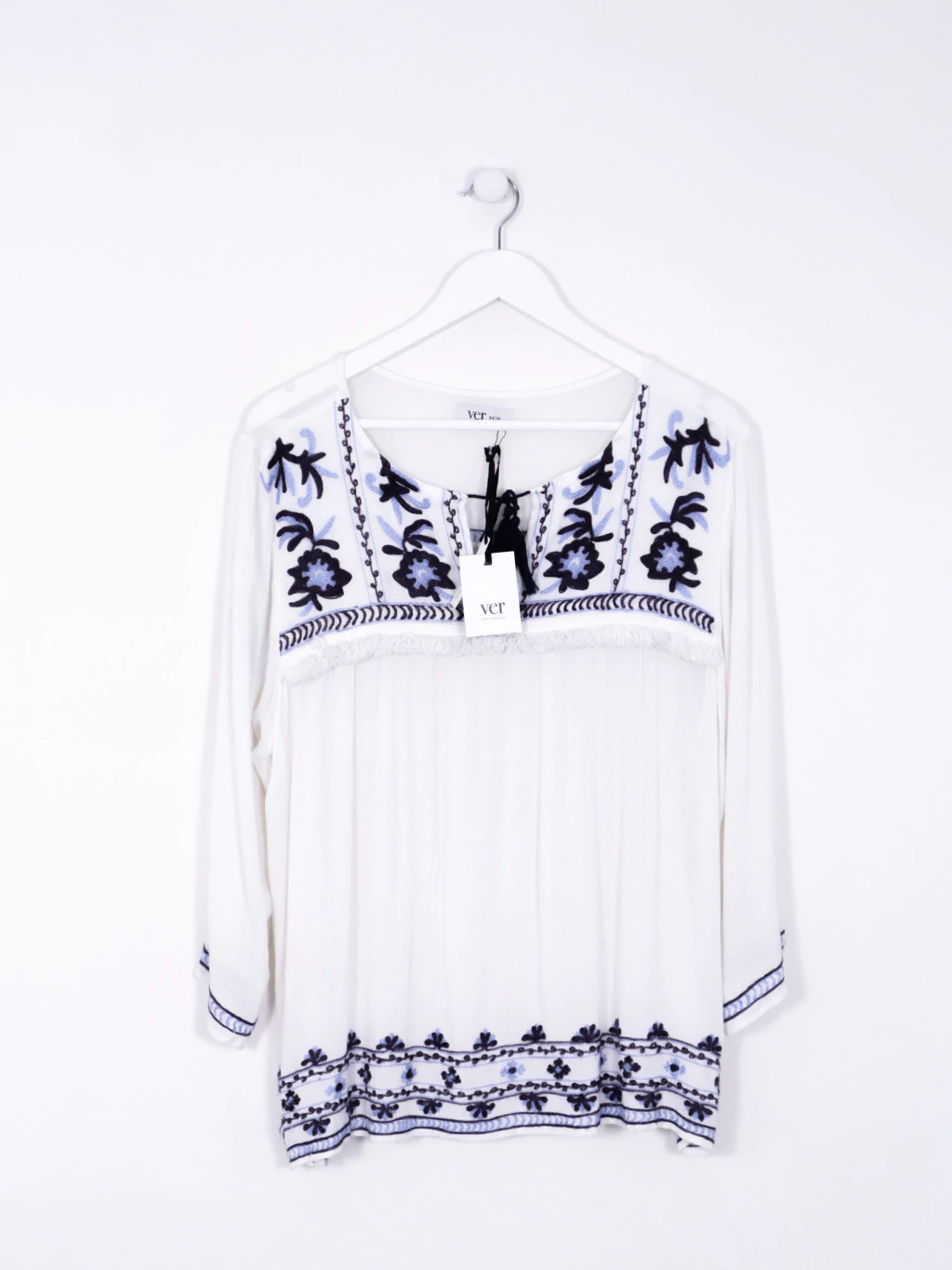 Blusa holgada liviana. Bordado floral en marrón, celeste y azul. Cuello en V con tiras anudables. Mangas 3/4. Recortes con flecos. Costuras a tono. Medidas - Ancho de hombros: 46 cm. Contorno de pecho: 112 cm. Largo total: 62 cm.