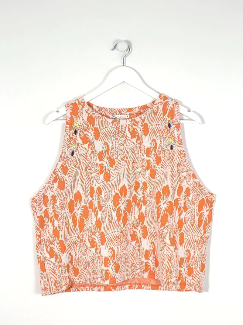 Blusa holgada de textil estilo jacquard en naranja y blanco con motivo floral. Sin mangas. Cuello redondo. Apliques de piedras fantasía en hombros. Medidas - Ancho de hombros: 31 cm. Contorno de pecho: 106 cm. Largo total: 53 cm.
