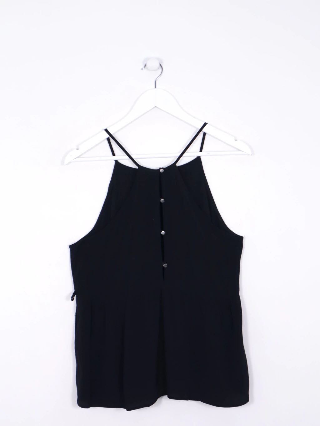 Blusa holgada de crepe. Cuello halter. Cuatro botones plateados en parte trasera. Medidas - Contorno de pecho: 88 cm. Largo total: 62 cm.