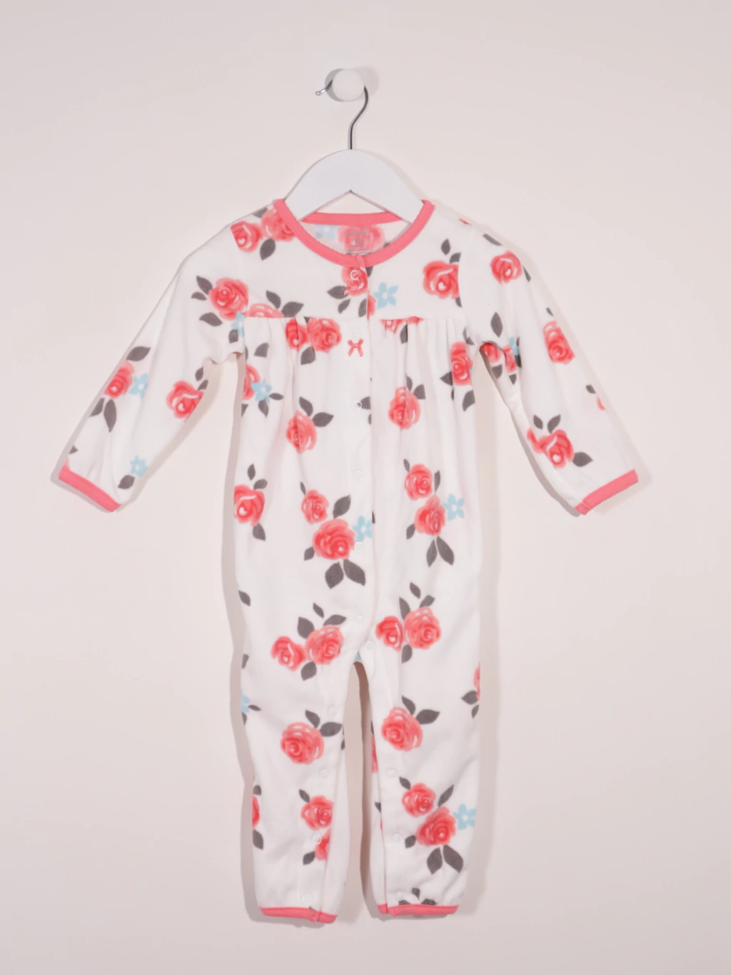 Body de micropolar estampado de flores. Cuello redondo. Mangas largas. Broches snap en delantera y entrepierna con detalles de moños. Medidas - Ancho de hombros: 21 cm. Contorno de pecho: 58 cm. Contorno de cintura: 58 cm. Contorno de cadera: 60 cm. Largo total: 66 cm.