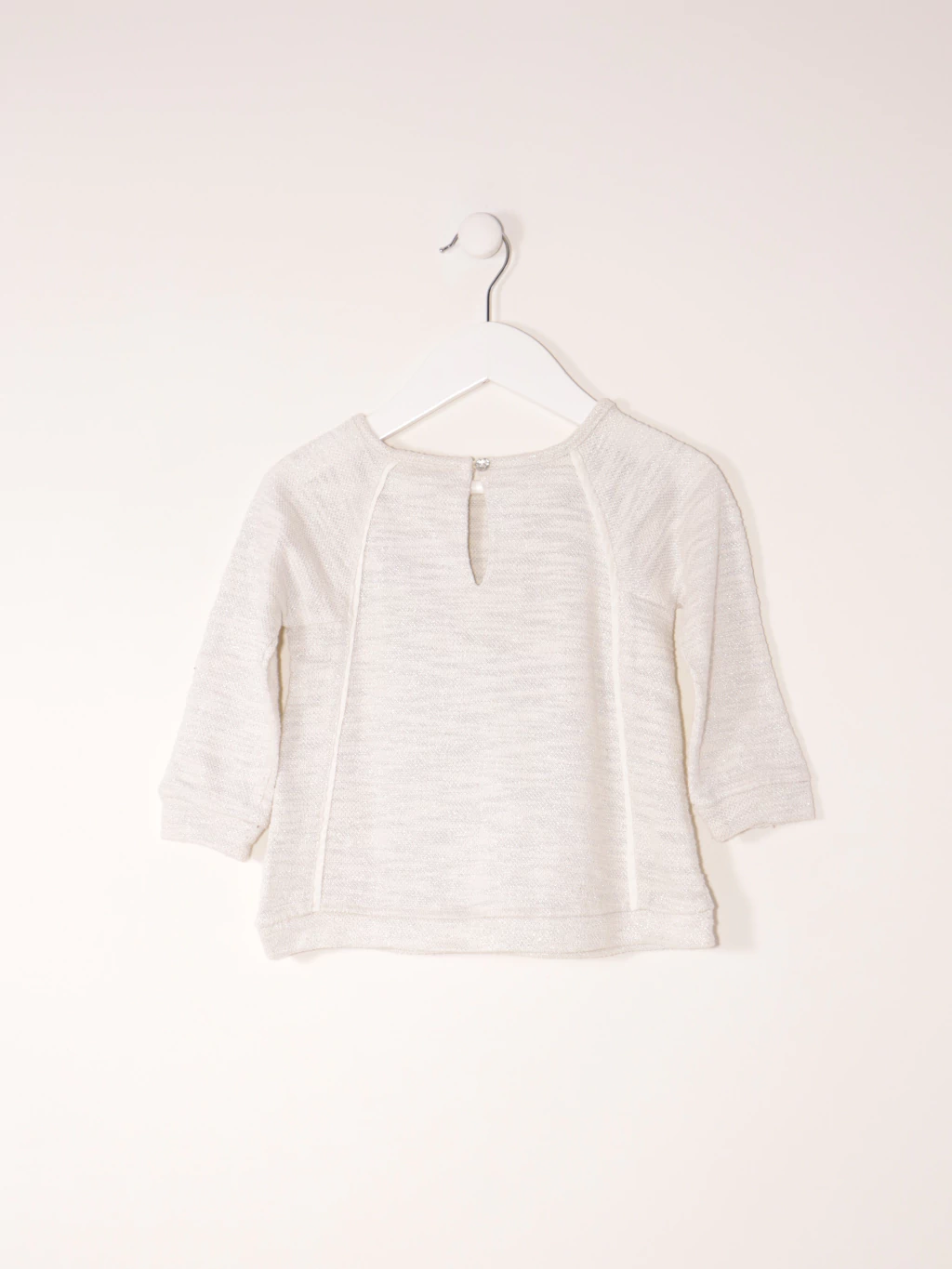 Buzo rústico. Tono gris. Efecto con Lúrex. Recorte central con estampa a tono. Cuello redondo. Manga larga. Ojo de cerradura con botón transparente. Medidas - Ancho de hombros: 26 cm. Contorno de pecho: 58 cm. Largo total: 36 cm.