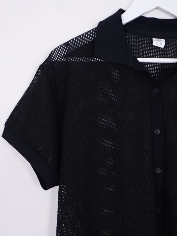 Camisa adherente de red. Cuello camisero de ribb. Mangas cortas. Botones y costuras a tono. Medidas - Ancho de hombros: 48 cm. Contorno de pecho: 116 cm. Largo total: 62 cm.