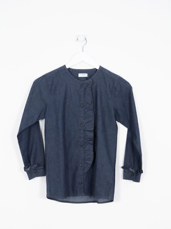 Camisa de denim con costuras a contratono. Cuello redondo. Cartera de botones con volados. Medidas - Ancho de hombros: 32 cm. Contorno de pecho: 70 cm. Largo total: 60 cm.