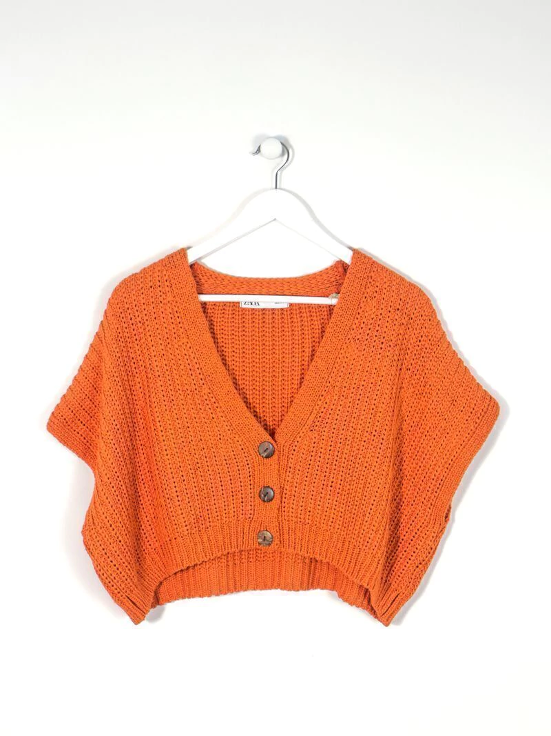Cárdigan crop oversize de tejido pesado. Tono mandarina. Sin mangas. Hombros caidos. Medidas - Ancho de hombros: 70 cm. Contorno de pecho: 120 cm. Largo total: 40 cm.