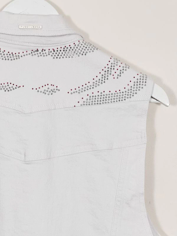 Chaleco adherente de denim. Apliques de strass en plateado y rosa. Cuello camisero. Dos bolsillos. Botones metálicos. Costuras a tono. Medidas - Ancho de hombros: 35 cm. Contorno de pecho: 98 cm. Largo total: 60 cm.
