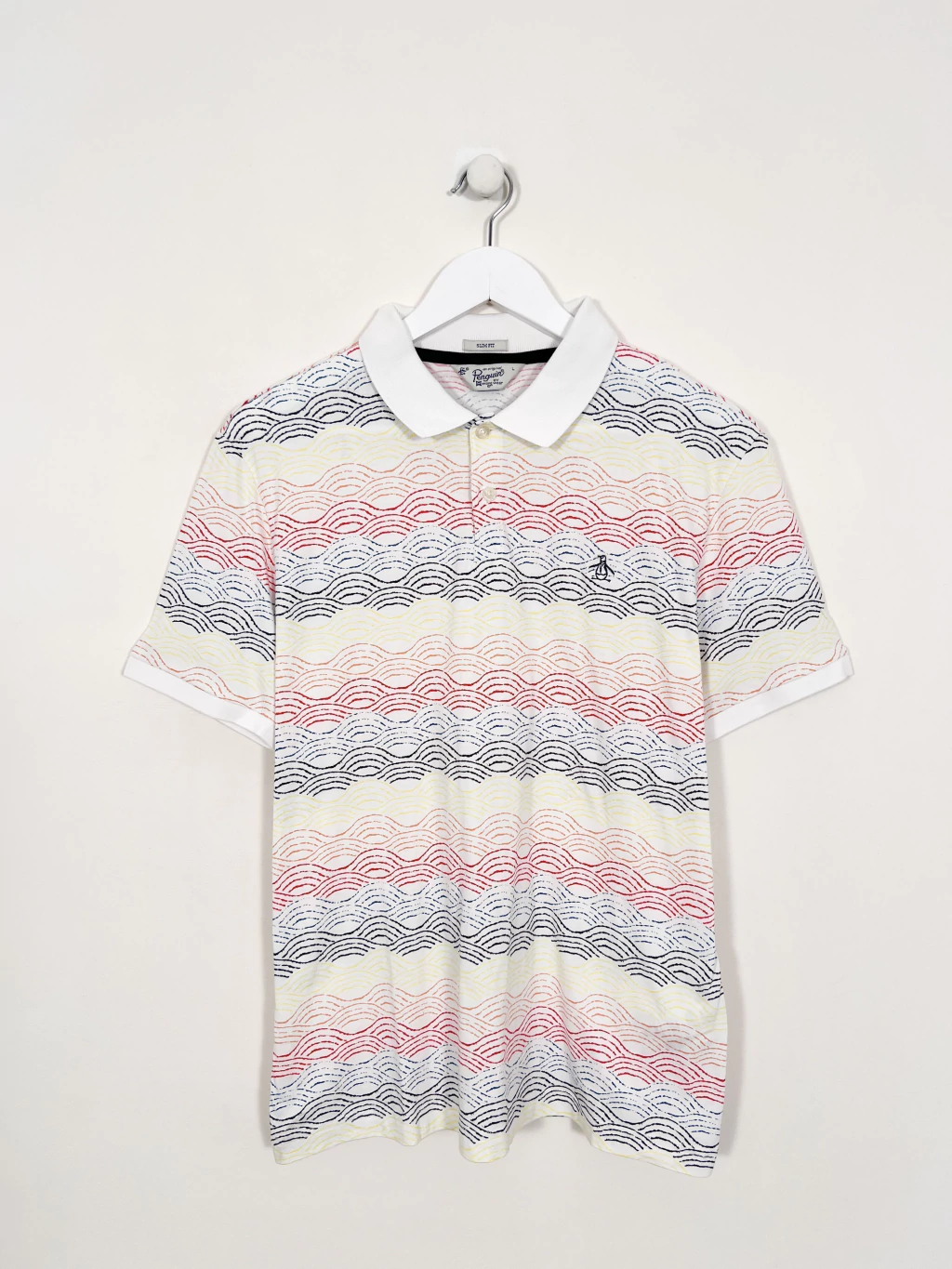 Chomba holgada de algodón. Motivo en negro, azul, rojo, amarillo y naranja. Cuello camisero de ribb. Mangas cortas. Botones y costuras a tono. Medidas - Ancho de hombros: 43 cm. Contorno de pecho: 102 cm. Largo total: 66 cm.