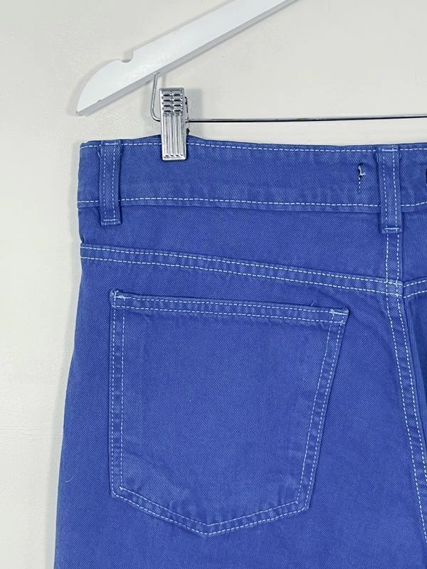 Jean adherente recto. Tono azul francia. Tiro alto. Cintura con botón y cierre metálicos. Cinco bolsillos. Costuras en blanco. Medidas - Contorno de cintura: 90 cm. Contorno de cadera: 100 cm. Largo total: 120 cm.