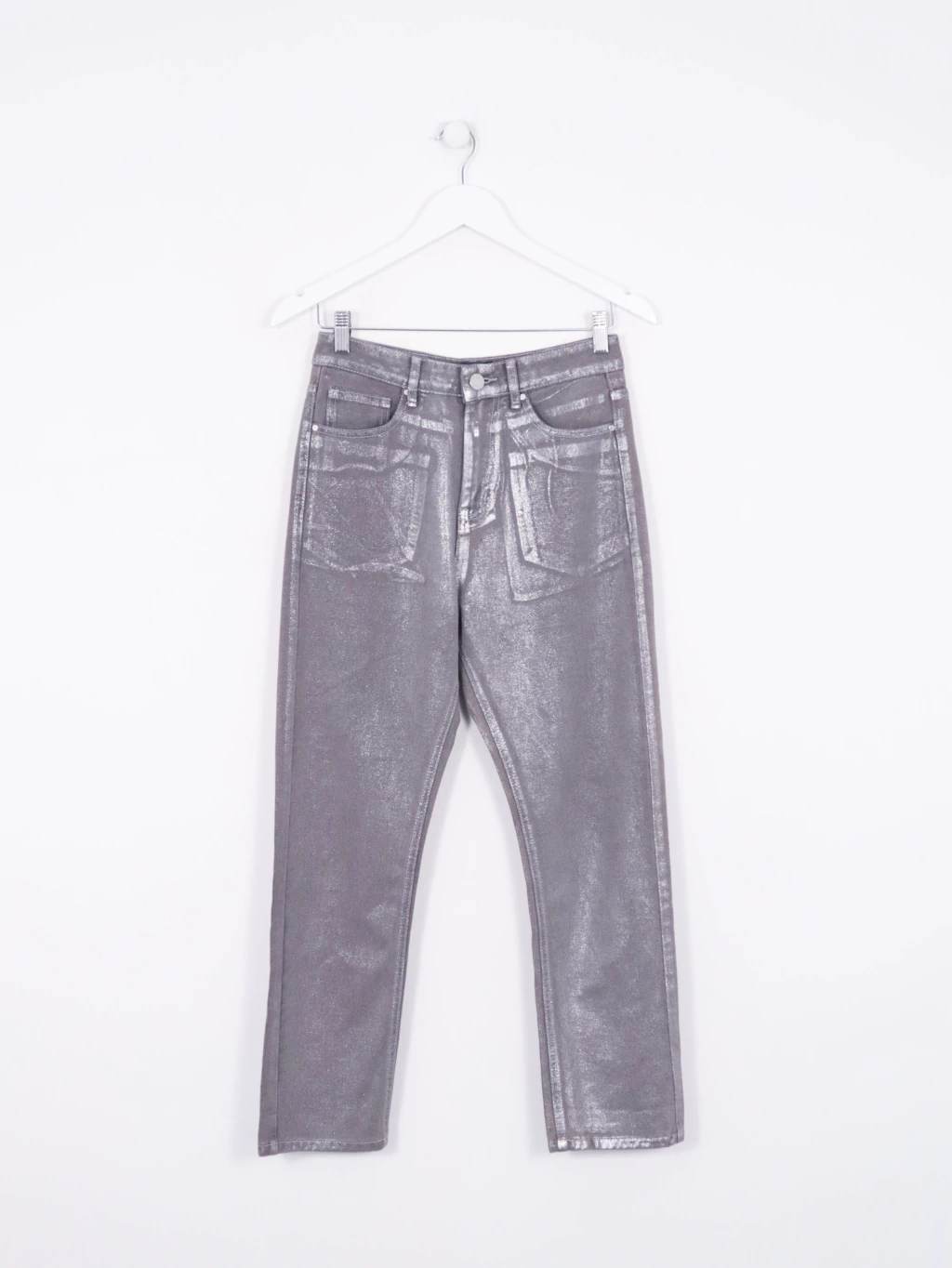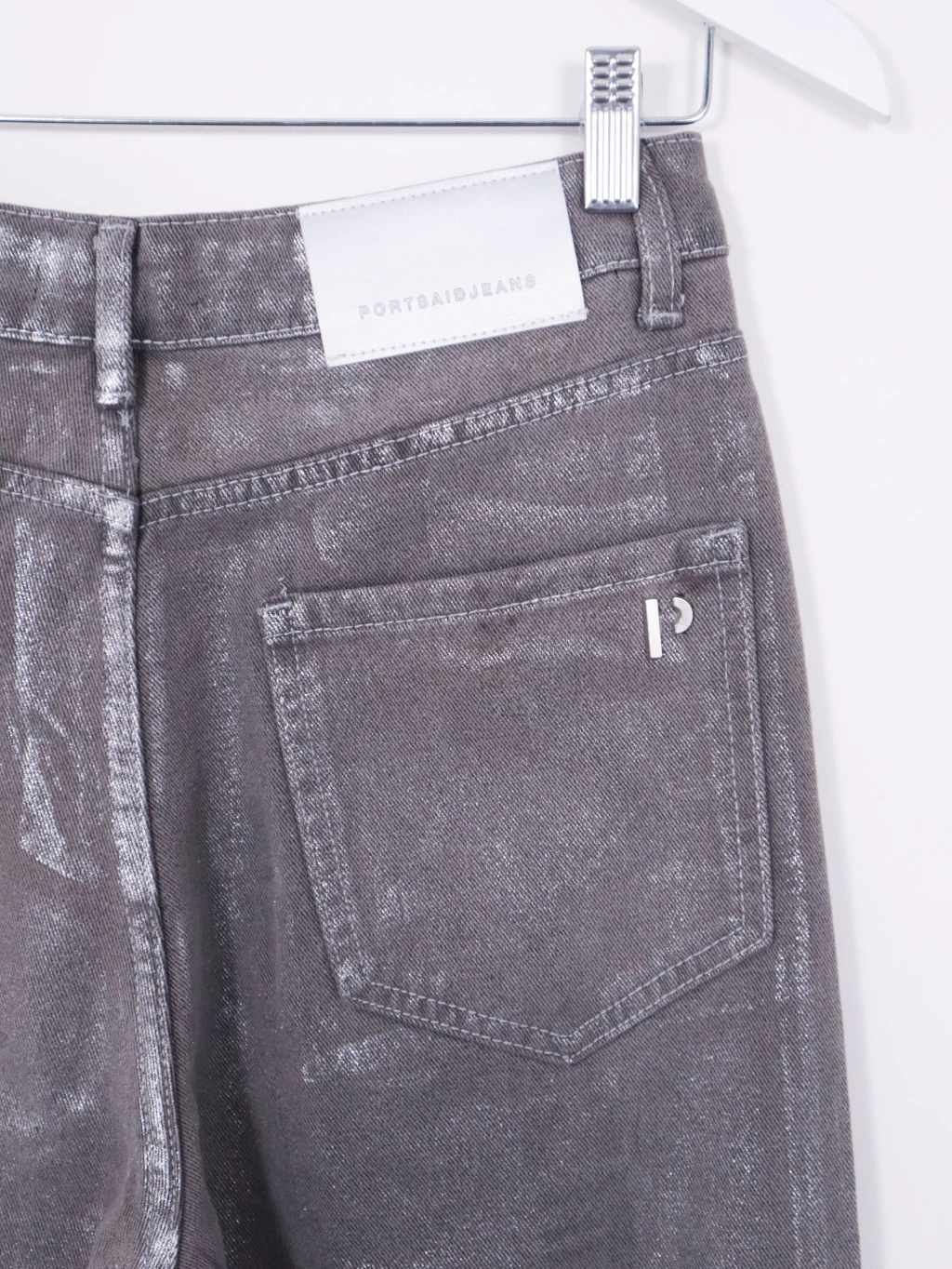 Jean adherente recto. Tono gris oscuro. Motivo foil plateado. TIro alto. Cintura con botón y cierre metálicos. Cinco bolsillos. Costuras a tono. Medidas - Contorno de cintura: 70 cm. Contorno de cadera: 86 cm. Largo total: 95 cm.