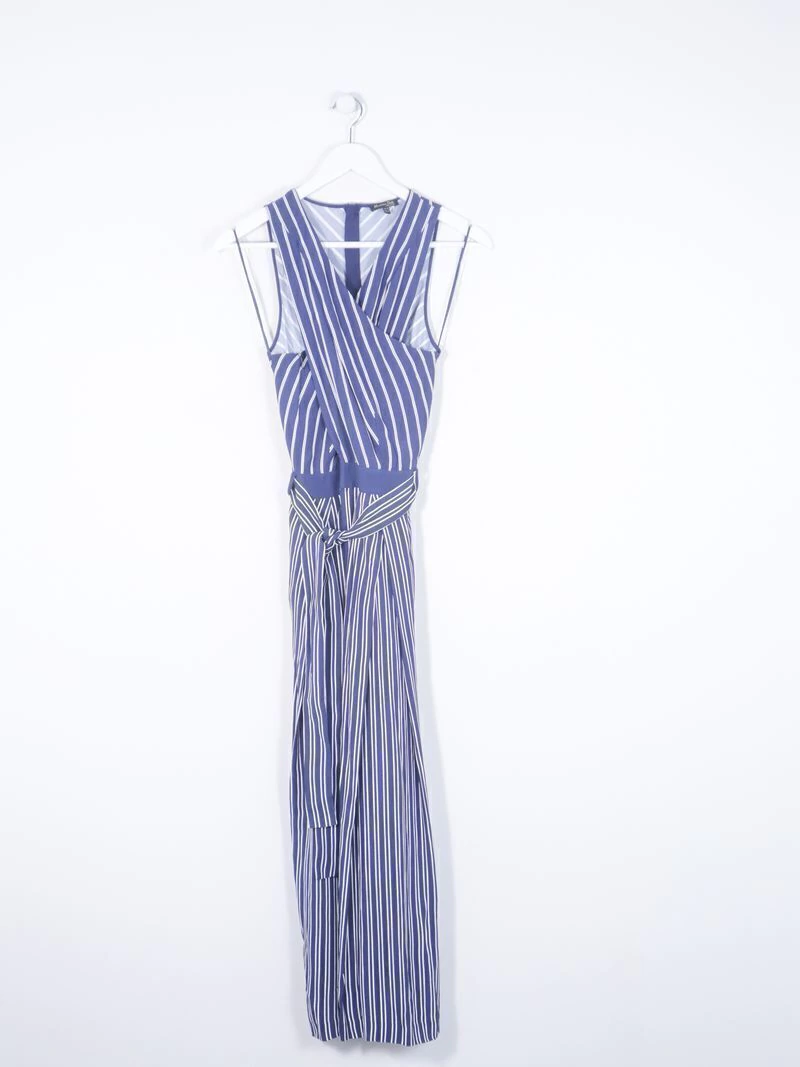 Mono en tono azul marino con rayas blancas. Lazo en cintura. Delantera cruzada. Pinzas en parte inferior. Cierre en trasera. Medidas - Ancho de hombros: 28 cm. Contorno de pecho: 76 cm. Contorno de cintura: 72cm. Contorno de cadera: 100 cm. Largo total: 127 cm.