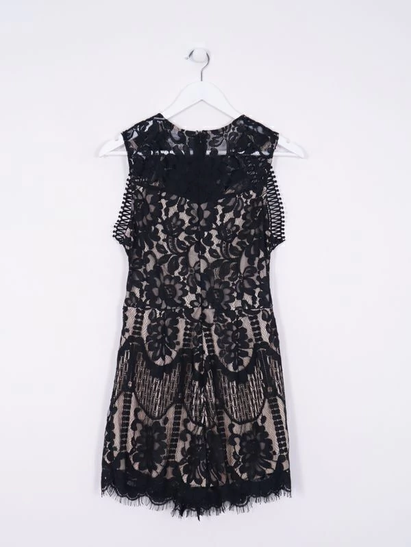Mono corto adherente de broderie. Tiro alto. Cierre invisible en espalda. Cuello redondo. Forrería en beige. Costuras a tono. Medidas - Ancho de hombros: 32 cm. Contorno de pecho: 80 cm. Contorno de cintura: 70 cm. Contorno de cadera: 116 cm. Largo total: 82 cm.