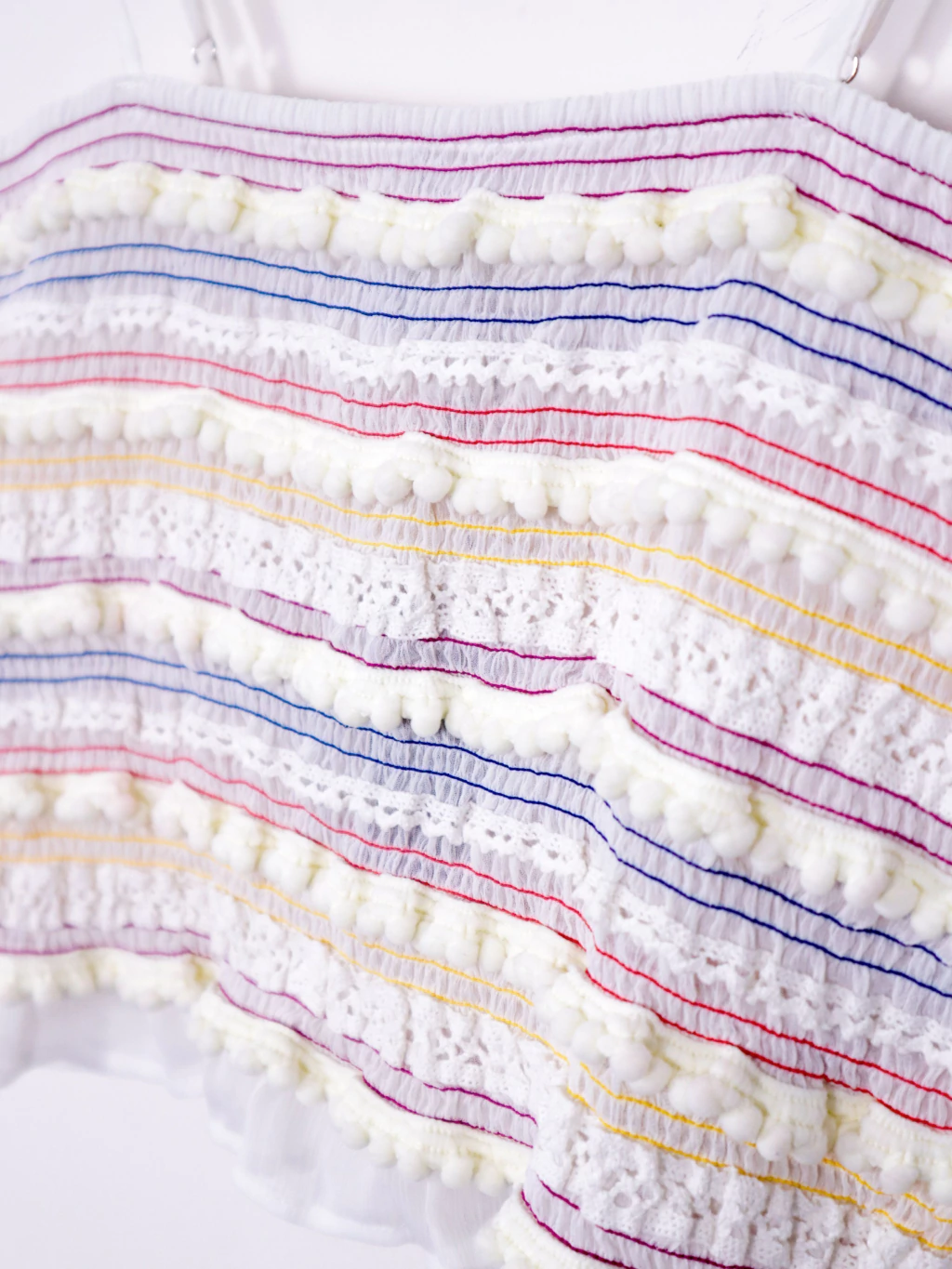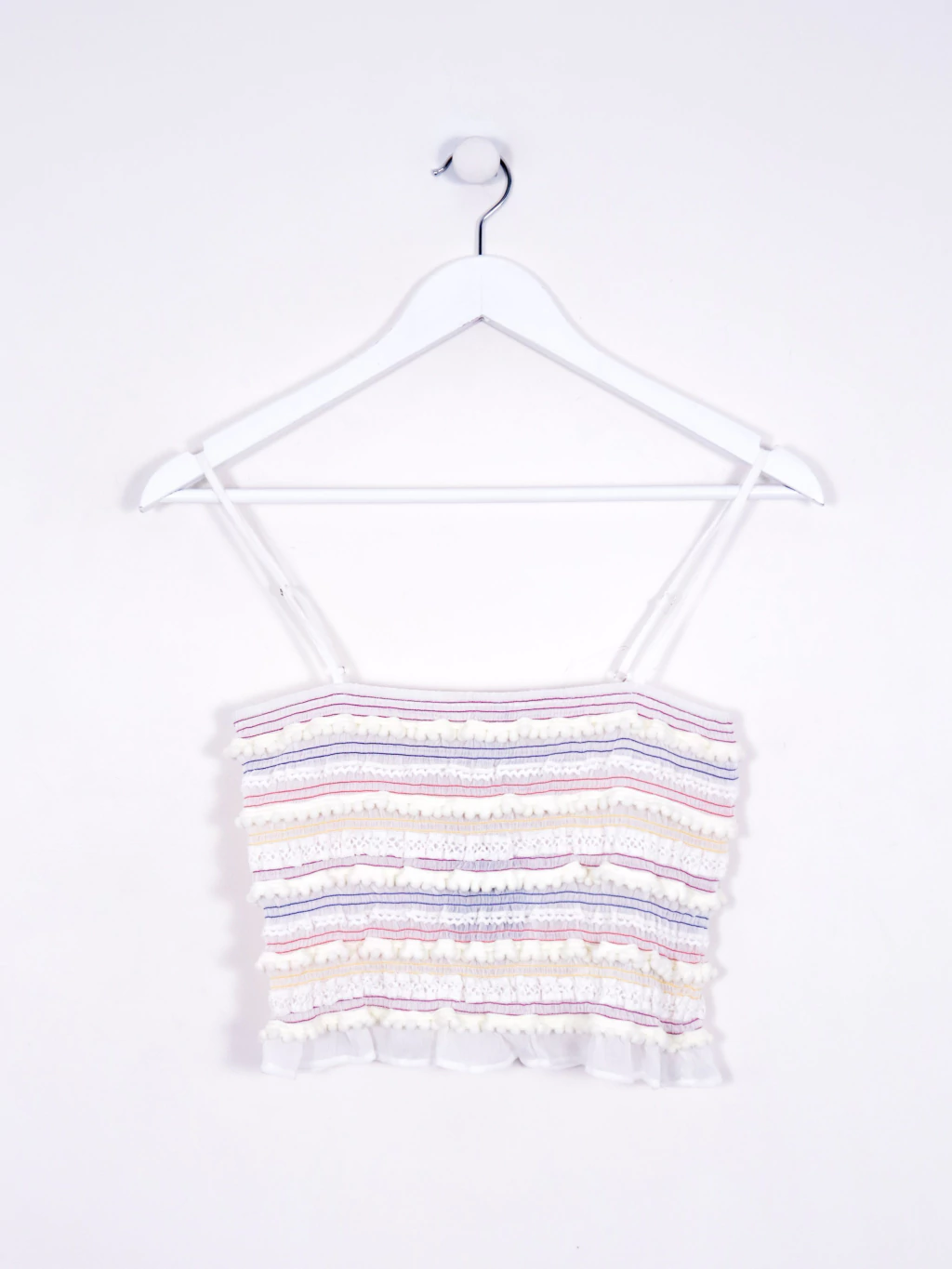 Musculosa con costuras elásticas y guardas con pompones. Breteles regulables.Medidas - Distancia de breteles: 17 cm. Contorno de pecho: 66 cm. Largo total: 25 cm.