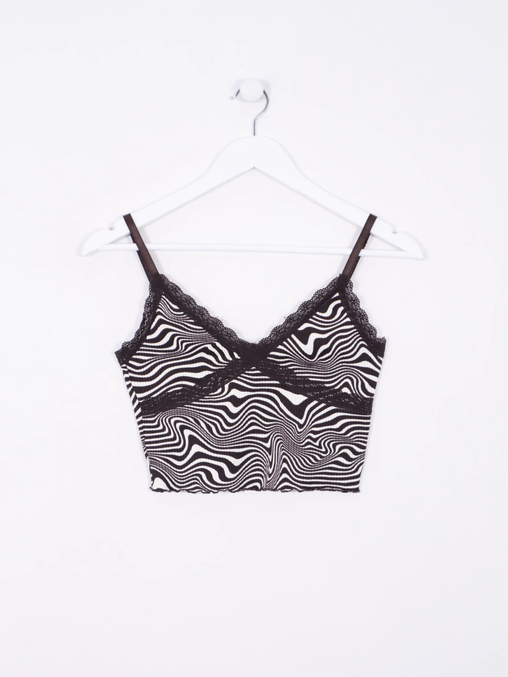 Musculosa de morley. Motivo de rayas curvas en marrón oscuro y crudo. Escote en V. Breteles regulables. Detalles de encaje en marrón. Medidas - Distancia de breteles: 22 cm. Contorno de pecho: 64 cm. Largo total: 38 cm.