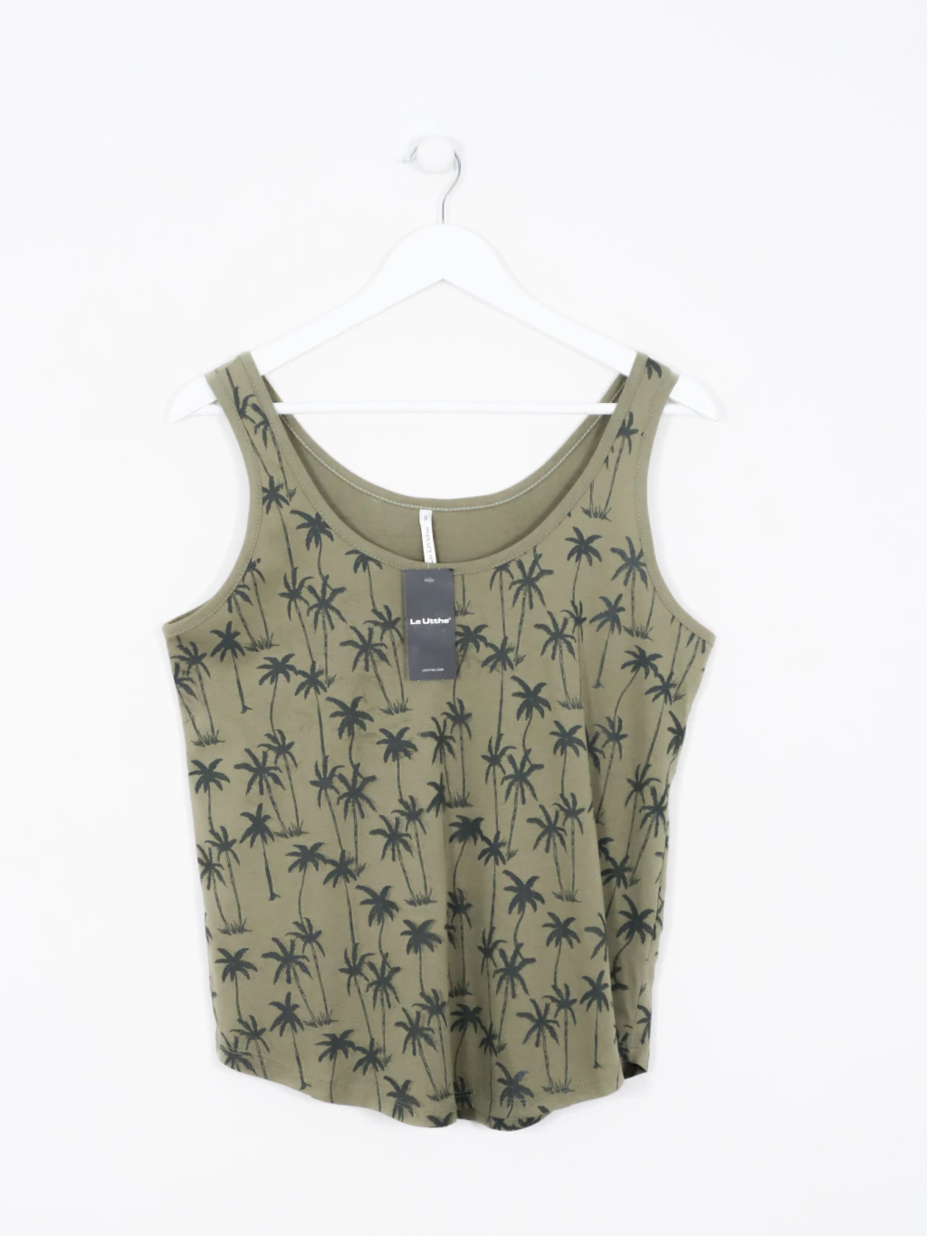Musculosa holgada de algodón. Escote redondo. Tono verde seco. Medidas - Ancho de hombros: 30 cm. Contorno de pecho: 92 cm. Largo total: 63 cm.