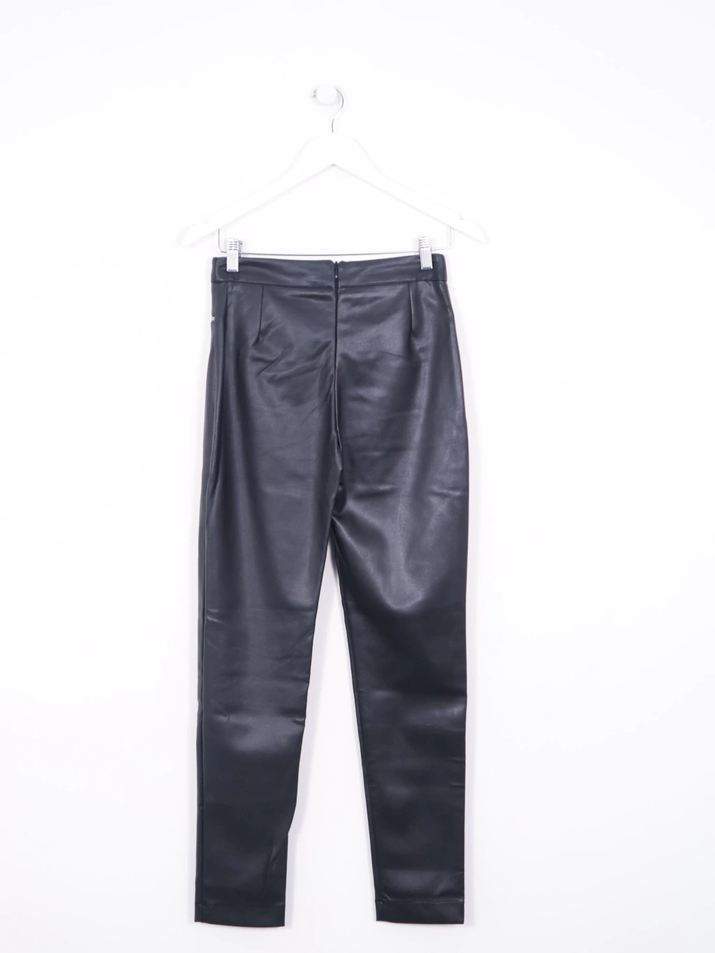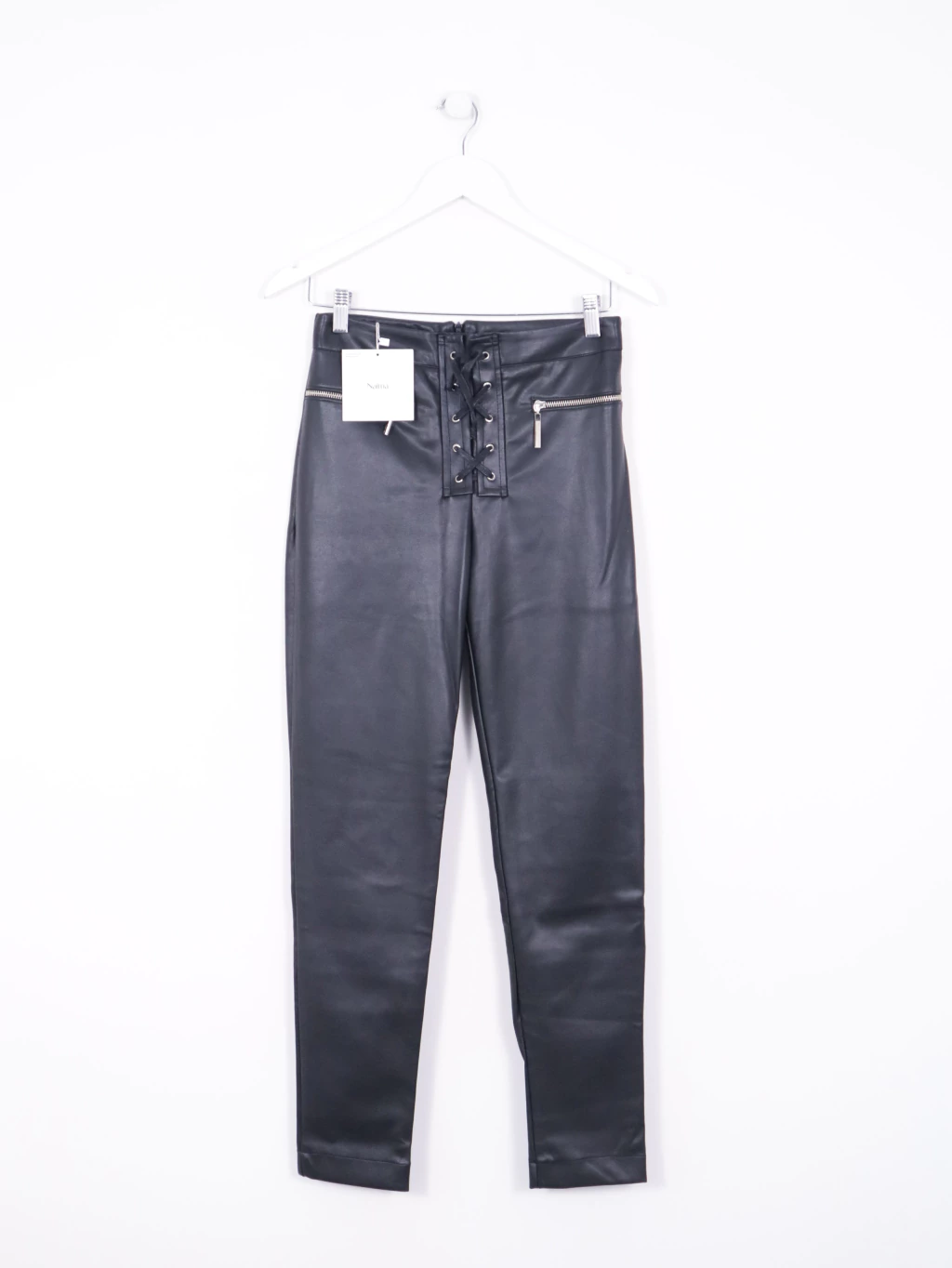 Pantalón recto adherente de ecocuero. Tiro alto. Cierre invisible en espalda. Ojales y cordón en delantero. Dos bolsillos con cierres. Costuras a tono. Medidas - Contorno de cintura: 70 cm. Contorno de cadera: 88 cm. Largo total: 99 cm.