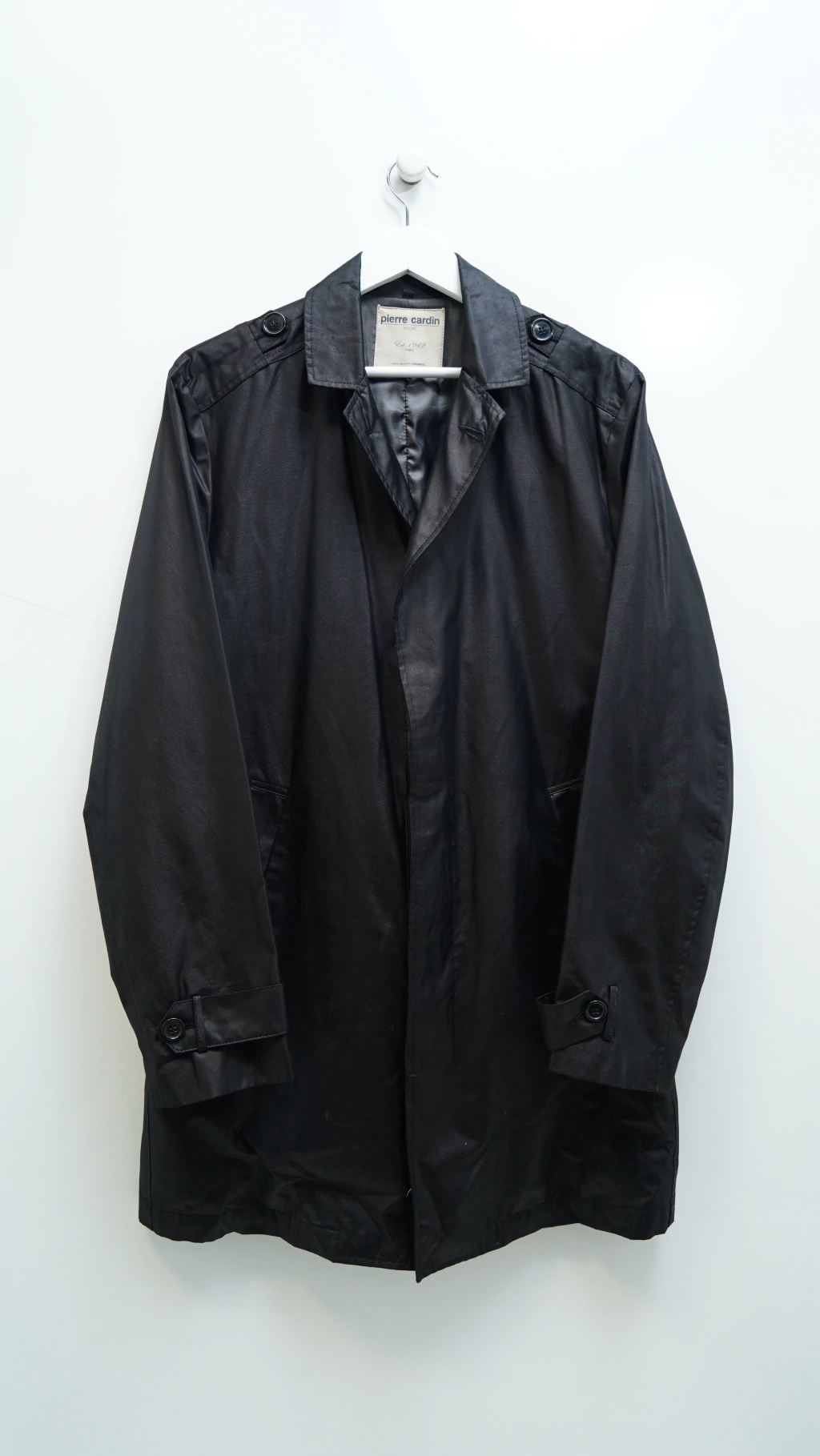 Piloto calce recto tono negro. Acabado brilloso. Cuello solapa. Manga larga. Cartera botones a tono. Dos bolsillos en frente. Forro a tono. Medidas - Ancho de hombros: 45 cm. Contorno de pecho: 116 cm. Largo total: 90 cm.