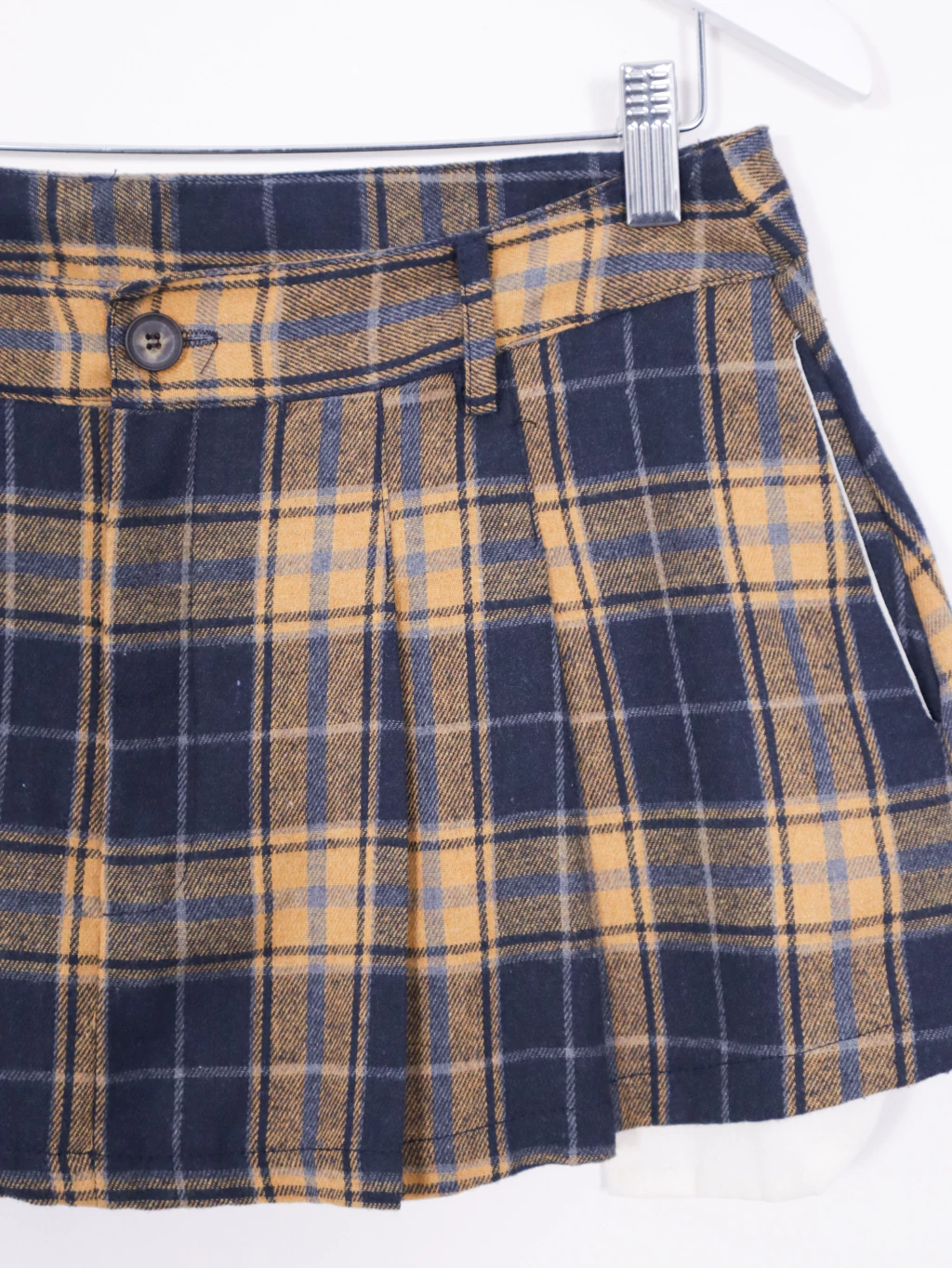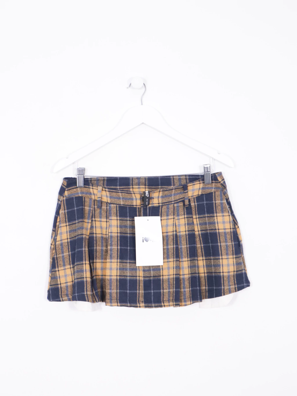 Pollera tableada tiro bajo. Motivo tartán en tono mostaza y azul marino. Dos bolsillos. Medidas - Contorno de cintura: 80 cm. Contorno de cadera: 96 cm. Largo total: 30 cm.