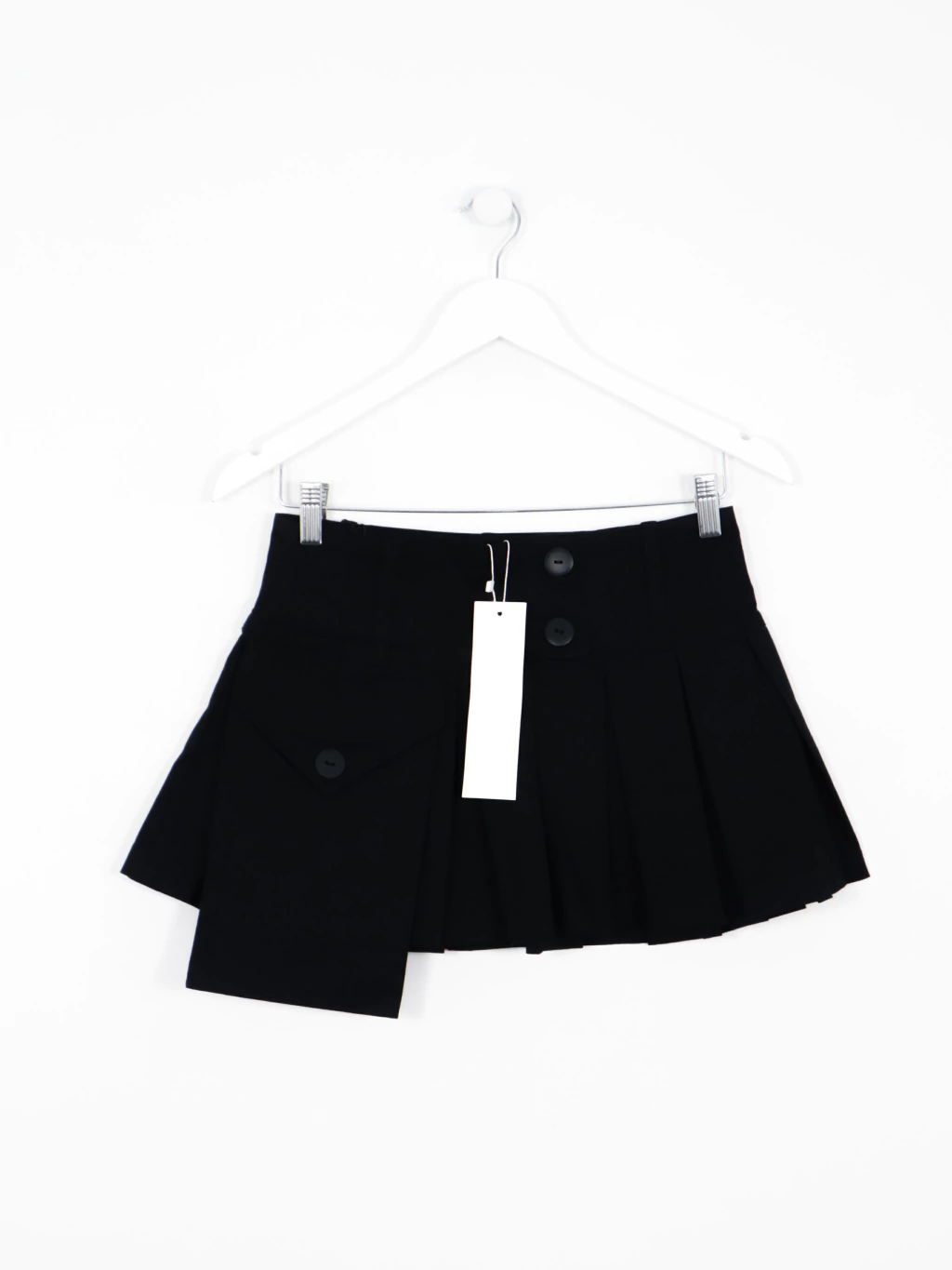 Pollera de gabardina tableada. Bolsillo cargo grande. Tiro bajo. Cintura ancha con dos botones. Medidas - Contorno de cintura: 62 cm. Contorno de cadera: 80 cm. Largo total: 35 cm.