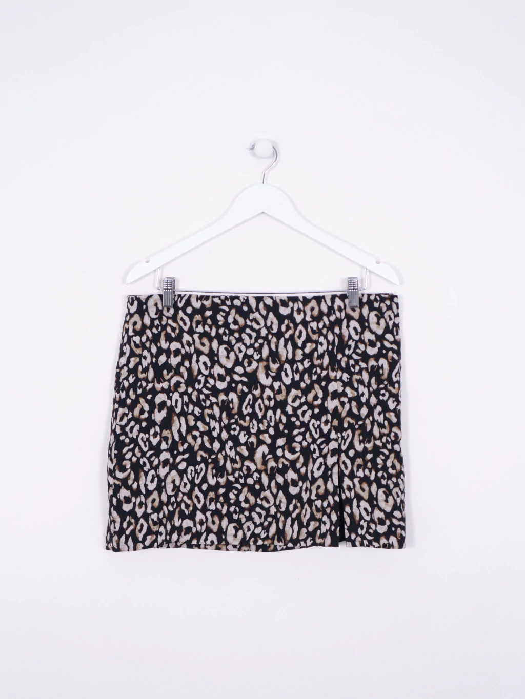 Pollera corta holgada liviana. Motivo animal print en beige y marrón. Tiro bajo. Cintura con elástico y cierre en lateral. Abertura en delantero. Costuras a tono. Medidas - Contorno de cintura: 88 cm. Contorno de cadera: 104 cm. Largo total: 40 cm.