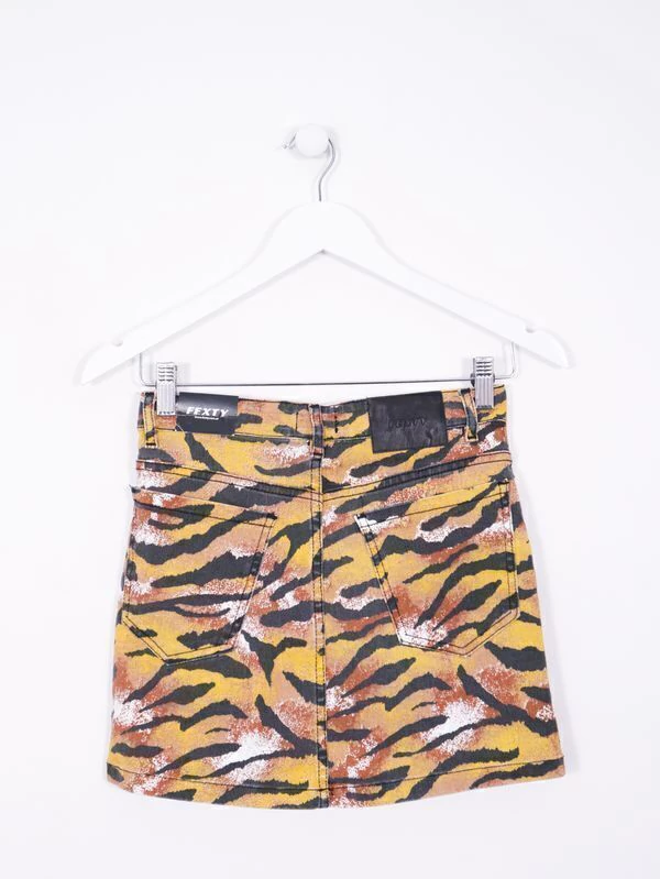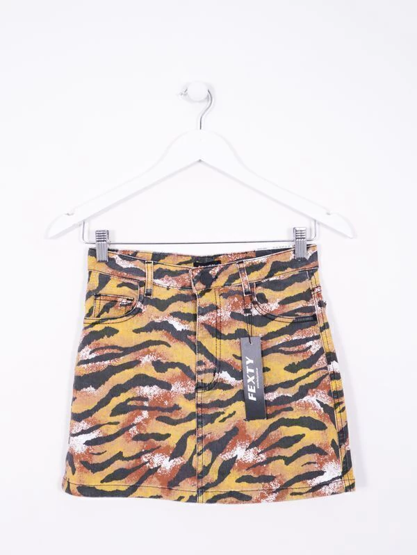 Pollera mini de gabardina elastizada. Tiro alto. Cinco bolsillos. Medidas - Contorno de cintura: 66 cm. Contorno de cadera: 80 cm. Largo total: 36 cm.