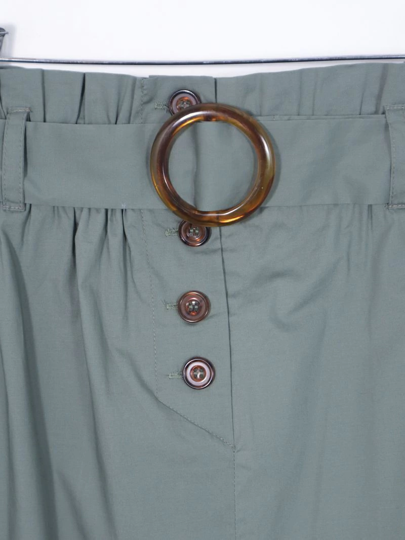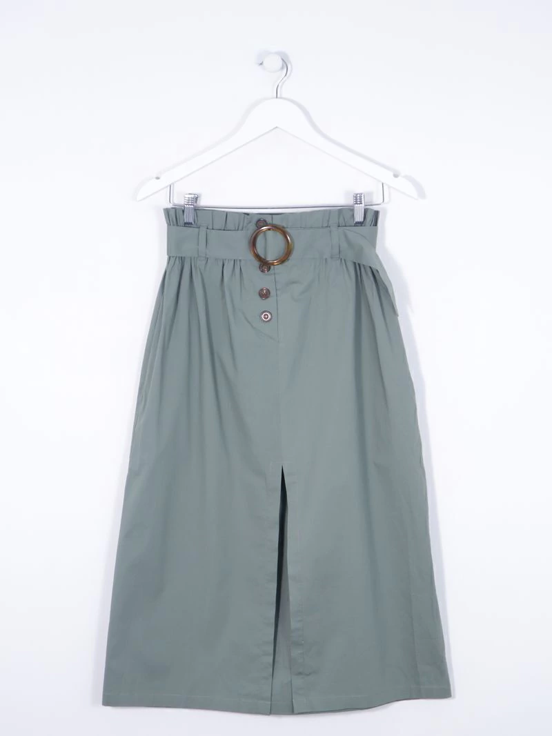 Pollera midi en tono verde seco claro. Tiro alto. Elástico en cintura. Cinco botones y lazo con argolla carey. Tajo en parte inferior delantera. Medidas - Contorno de cintura: 70 cm. Contorno de cadera: 104 cm. Largo total: 80 cm.
