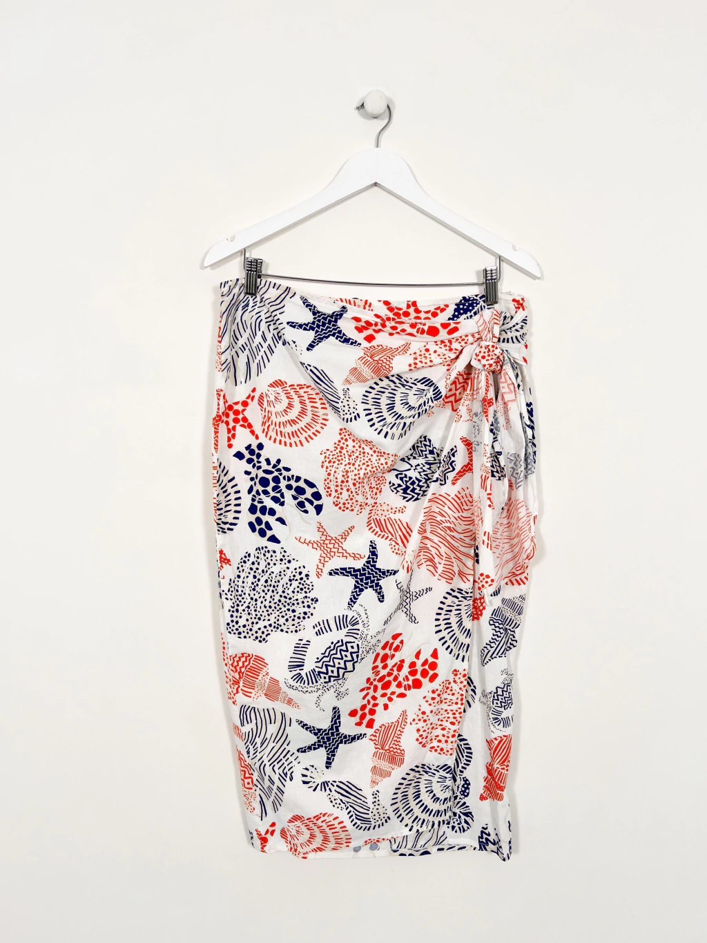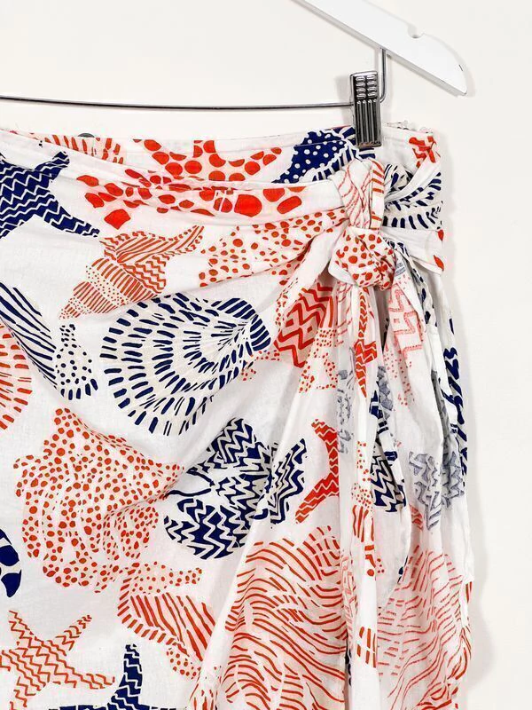 Pollera midi de algodón. Tono beige claro. Motivo en naranja y azul. Tiro alto Cintura con tira anudable. Cierre invisible en lateral. Costuras a tono. Medidas - Contorno de cintura: 80 cm. Contorno de cadera: 102 cm. Largo total: 75 cm.