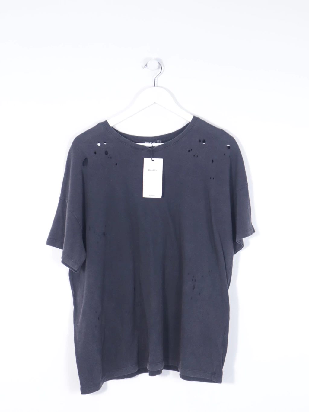 Remera oversize de algodón. Tono negro con efecto gastado. Detalles de roturas en delantera. Medidas - Ancho de hombros: 62 cm. Contorno de pecho: 116 cm. Largo total: 66 cm.