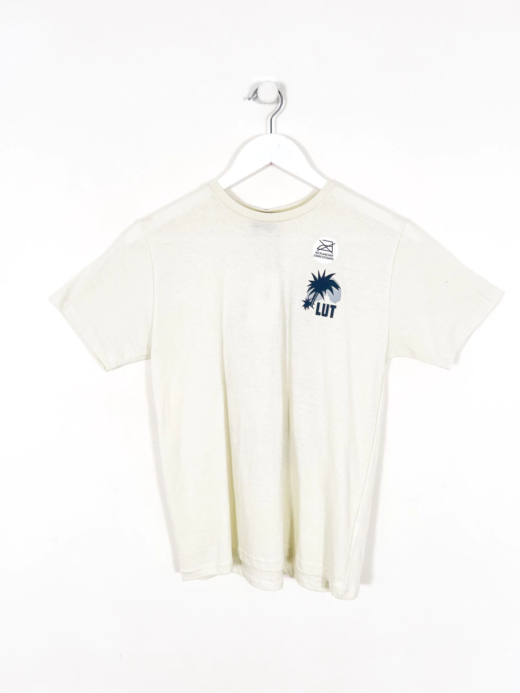 Remera de algodón con estampa en delantera y esplada. Tono hueso. Medidas - Ancho de hombros: 38 cm. Contorno de pecho: 86 cm. Largo total: 60 cm.