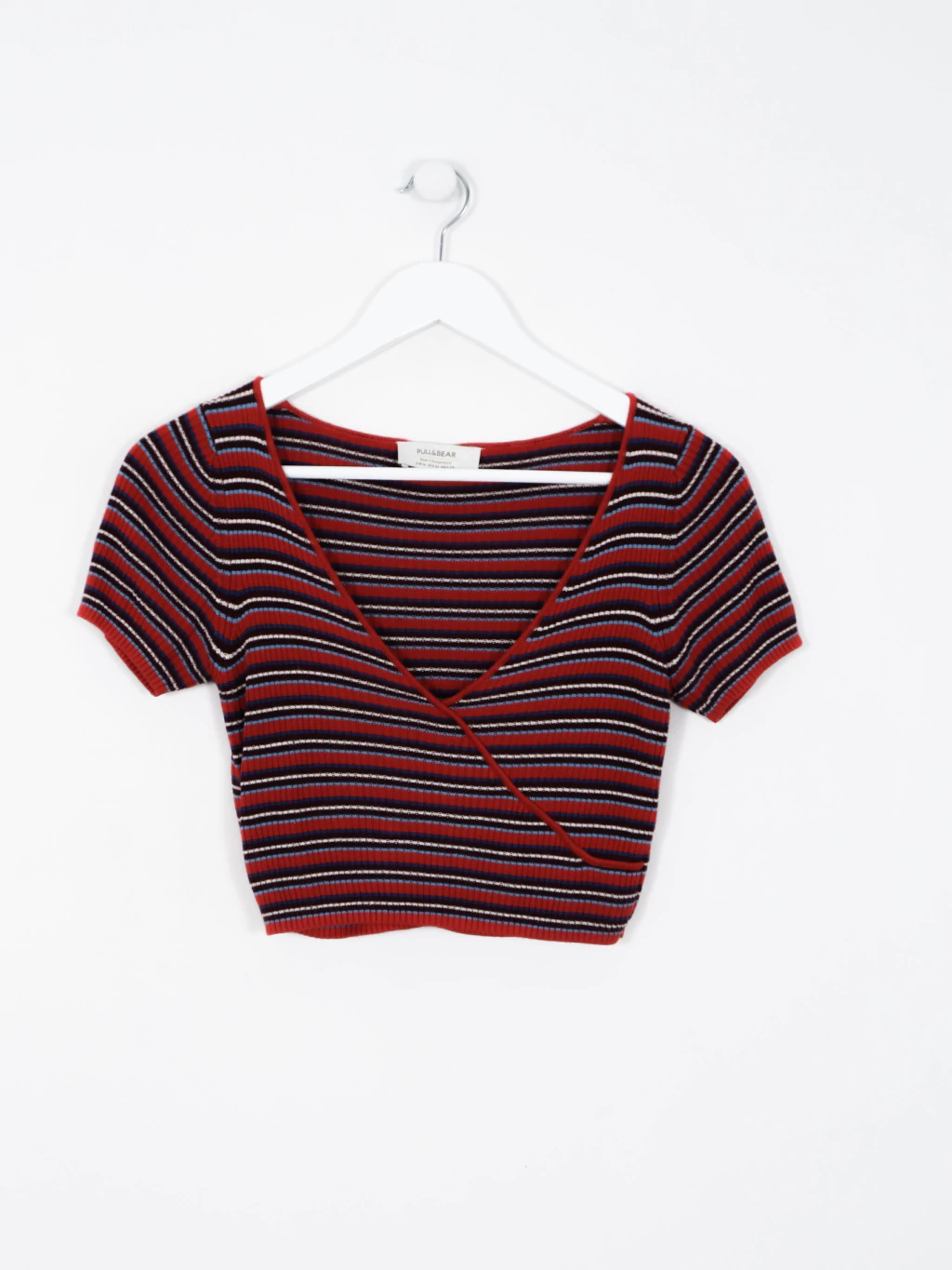 Remera de tejido liviano morley de calce adherente. Escote en V cruzado. Motivo rayado horizontal en rojo, celeste, bordó y blanco. Medidas - Ancho de hombros: 34 cm. Contorno de pecho: 80 cm. Largo total: 35 cm.