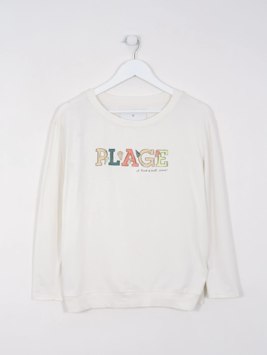 Remera holgada de algodón en tono curdo. Mangas largas. Medidas - Ancho de hombros: 47 cm. Contorno de pecho: 100 cm. Largo total: 59 cm.