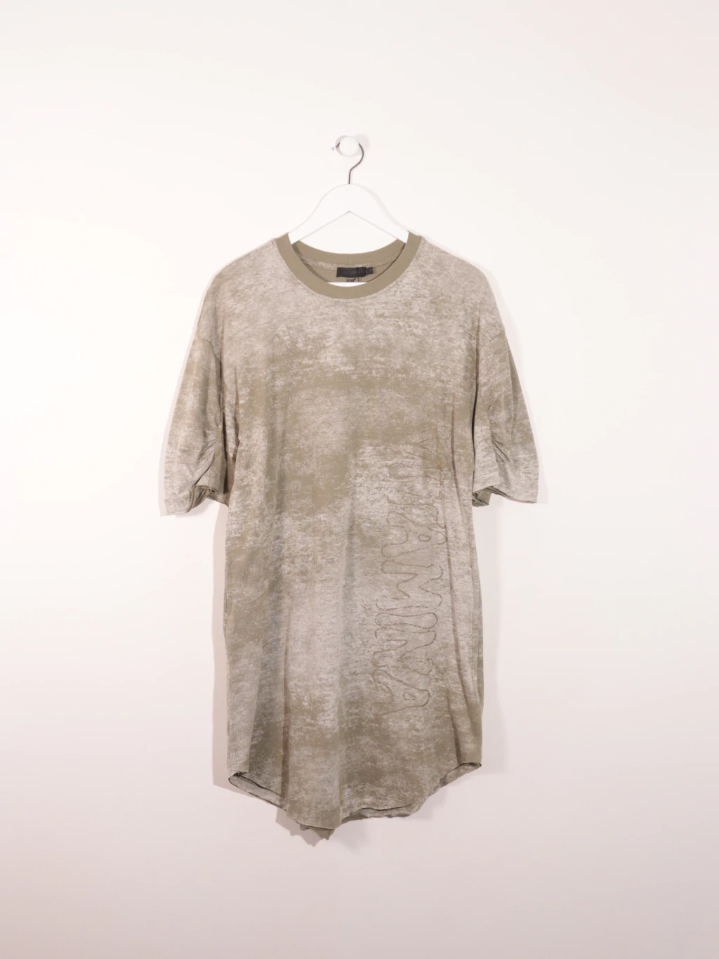 Remerón holgado en tono verde seco. Efecto desgastado. Cuello redondo. Mangas cortas. Medidas - Ancho de hombros: 55 cm. Contorno de pecho: 104 cm. Largo total: 92 cm.