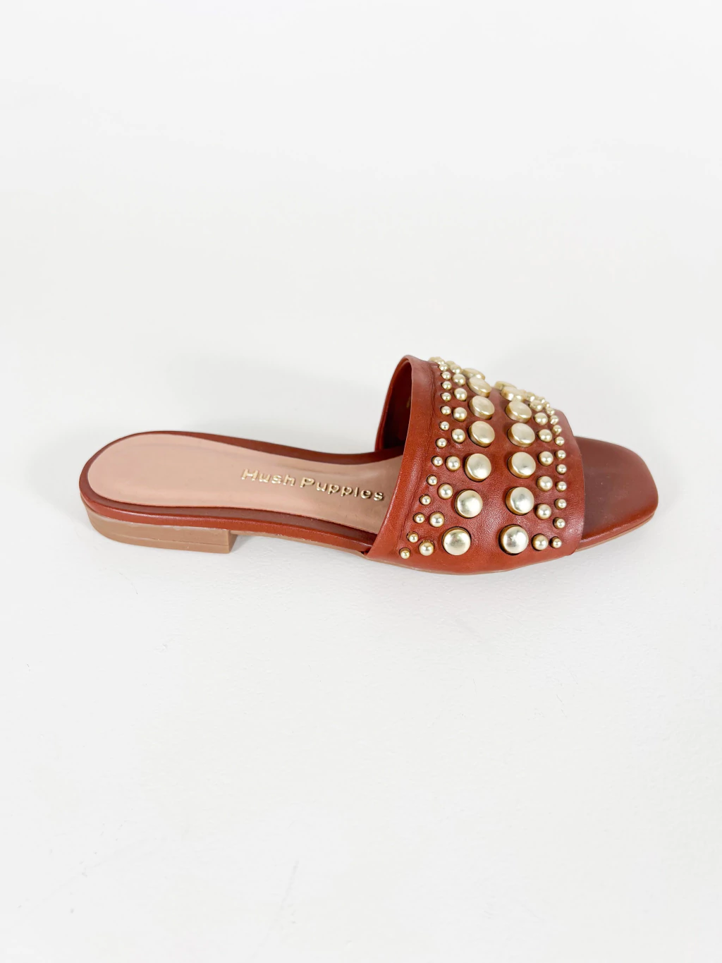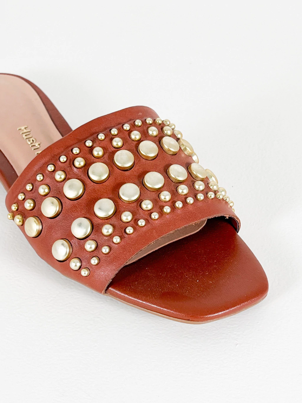 Sandalias estilo flats. Base de goma. Capellada con apliques metálicos en dorado. Costuras a tono. Medidas - Largo de suela: 22,5 cm. Altura de taco: 1 cm.