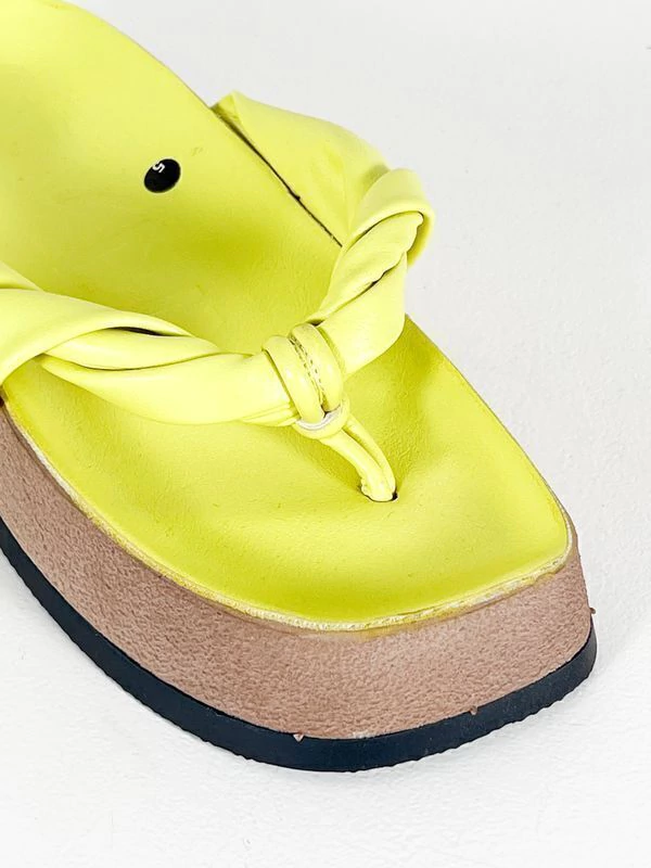 Sandalias estilo ojotas de ecocuero. Tono amarillo neón. Base plataforma de caucho. Tiras enroscadas. Costuras a tono. Medidas - Largo de suela: 22,5 cm. Altura de plataforma: 4 cm.