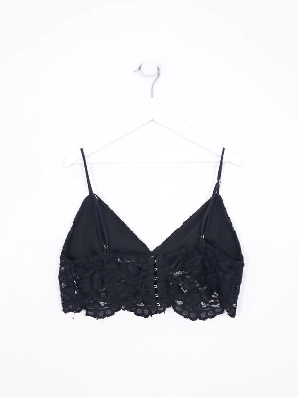 Top adherente de encaje. Escote en V. Dos breteles elásticos regulables. Hebillas metálicas en espalda. Costuras a tono. Medidas - Ancho de hombros: 21 cm. Contorno de pecho: 70 cm. Largo total: 22 cm.