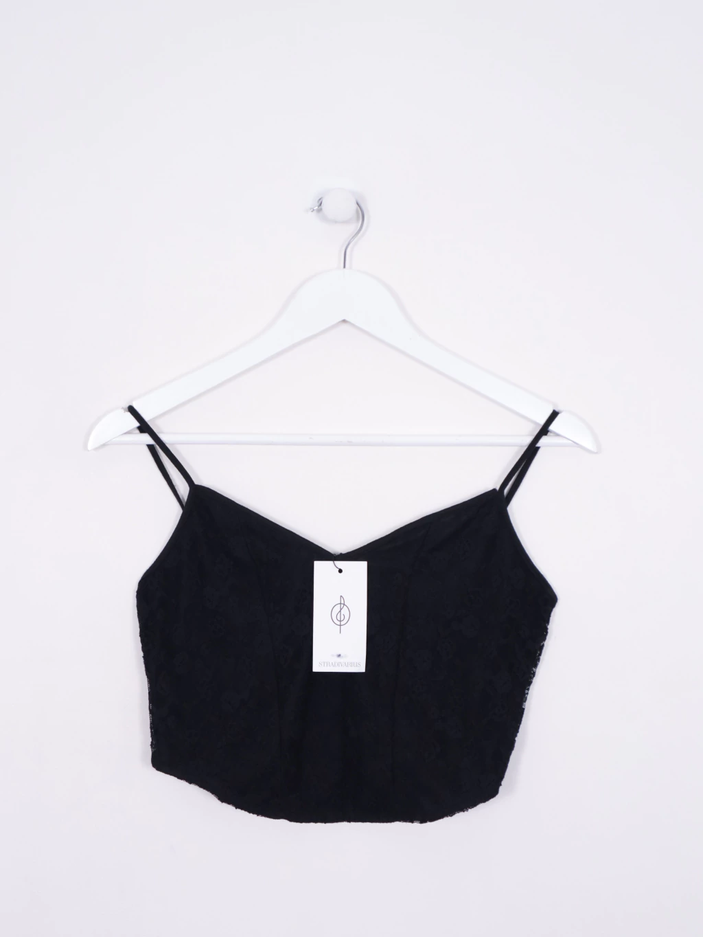Top de encaje de calce elastizado. Escote en V. Breteles regulables. Costuras elásticas en parte trasera. Transparencias en laterales. Medidas - Distancia de breteles: 24 cm. Contorno de pecho: 70 cm. Largo total: 36 cm.