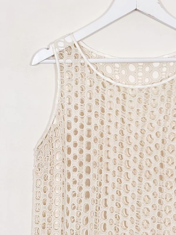 Vestido midi holgado calado tejido. Tono arena. Trama circular. Cuello redondo. Costuras a tono. Medidas - Ancho de hombros: 36 cm. Contorno de pecho: 92 cm. Contorno de cintura: 94 cm. Contorno de cadera: 104 cm. Largo total: 91 cm.