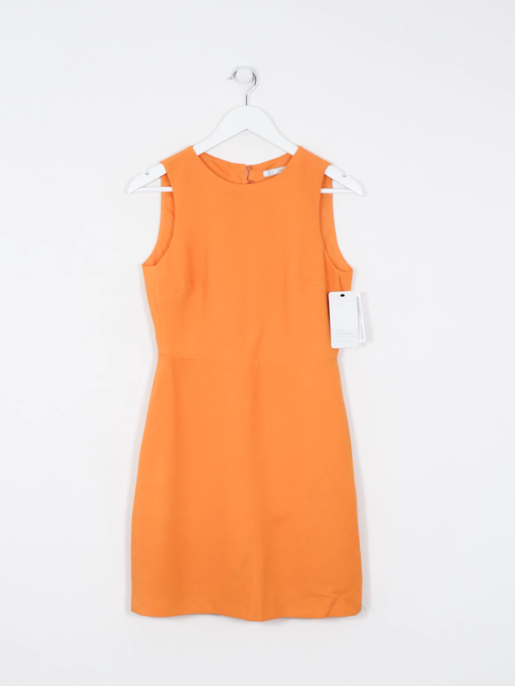 Vestido recto de calce adherente en tono naranja neón. Cuello redondo. Ojo de cerradura en espalda. Cierre invisible en parte inferor trasera. Medidas - Ancho de hombros: 31 cm. Contorno de pecho: 86 cm. Contorno de cintura: 72 cm. Contorno de cadera: 90 cm. Largo total: 85 cm.