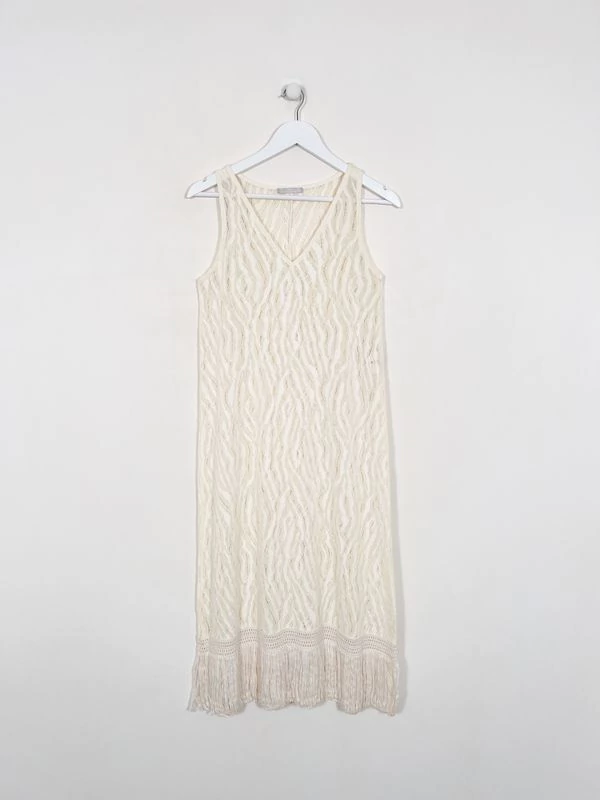 Vestido musculosa largo tejido liviano. Tono beige claro. Escote en V. Ruedo con flecos. Costuras a tono. Medidas - Ancho de hombros: 28 cm. Contorno de pecho: 78 cm. Contorno de cintura: 86 cm. Contorno de cadera: 104 cm. Largo total: 118 cm.